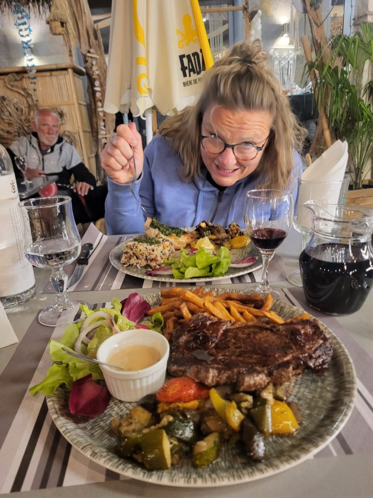 Daarna na het enige restaurantje hier gelopen. Ligt naast de camping. Daar lekker gegeten. Heike vis en ik vlees.
