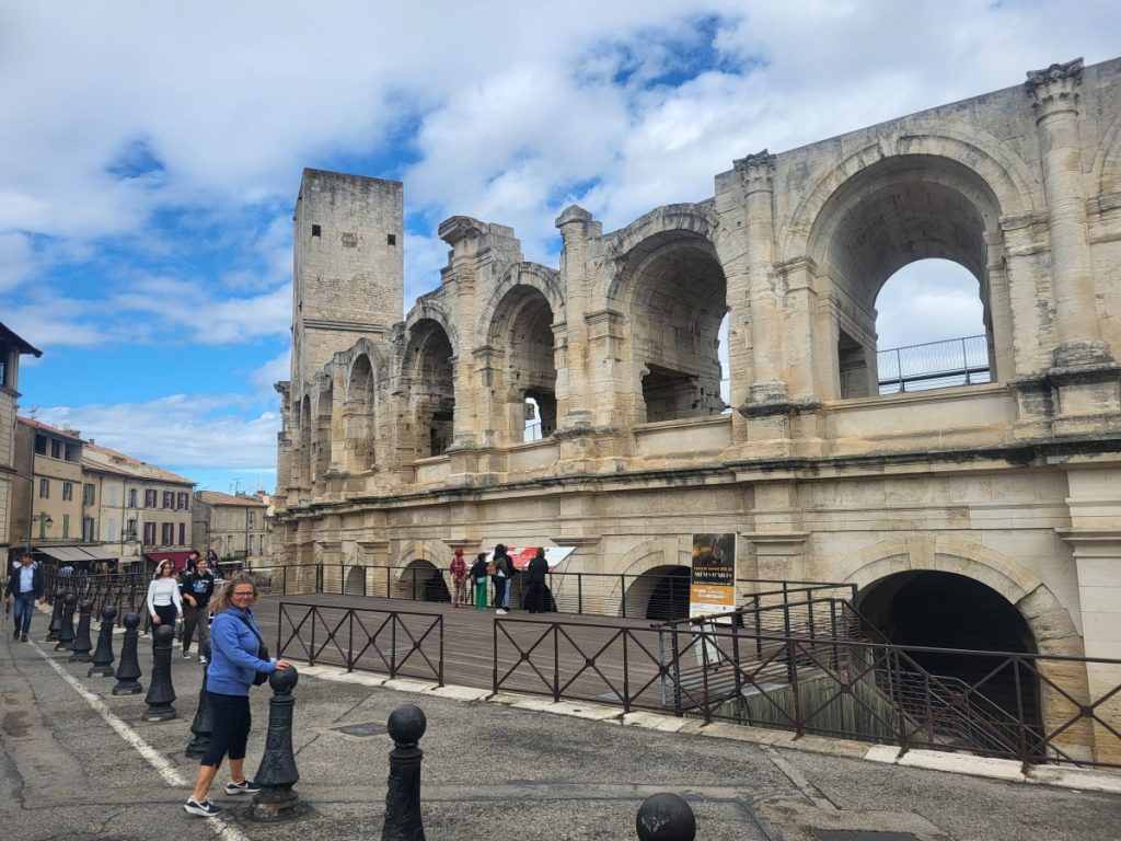 Beetje bewolkt, behoorlijke wind en temperatuur blijft net onder de 20 graden. Geen strandweer dus. Laten we dan naar Arles gaan met de Camper. Ook maar eens uitproberen hoe het is om je tafel en stoelen te laten staaan op je plekje, inruimen en wegwezen. Viel alles best mee. Zelfs de fietsen achterop, want we zijn onze eigen Baja Bikes gestart.